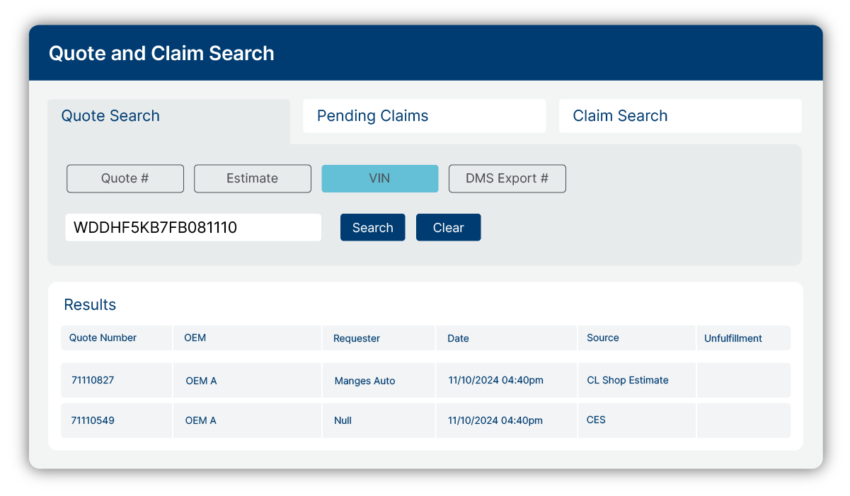 - Through the MyPriceLink Quote Search tool in the OEC portal using a VIN or Quote ID provided on the estimate.